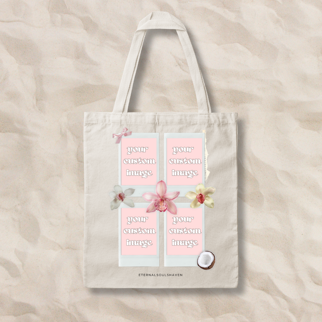 Introducing our customizable tote bag, infused with beachy vibes and the charm of personalized polaroids. Capture your favorite moments by submitting your pictures, creating a unique and memorable accessory that embodies your personal style. Perfect for beach outings, shopping, or everyday use, this tote bag combines functionality with sentimental value, making it an ideal companion for those who cherish both fashion and memories.